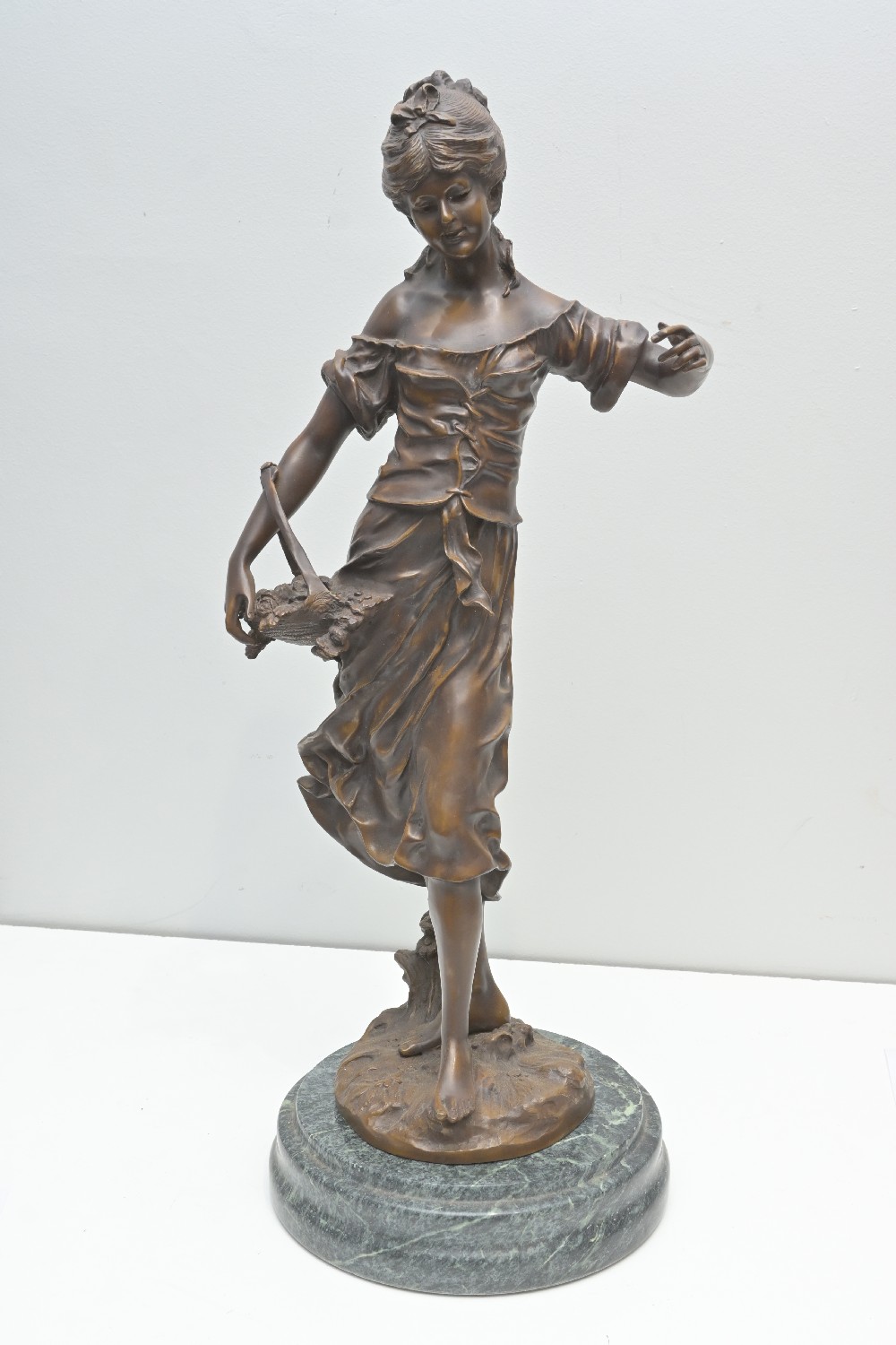 AN ART NOUVEAU STYLE PATINATED SPELTER FIGURE ON MARBLE BASE (A/F) (88H X 30DIA CM) (LEONARD JOEL DELIVERY SIZE: LARGE)