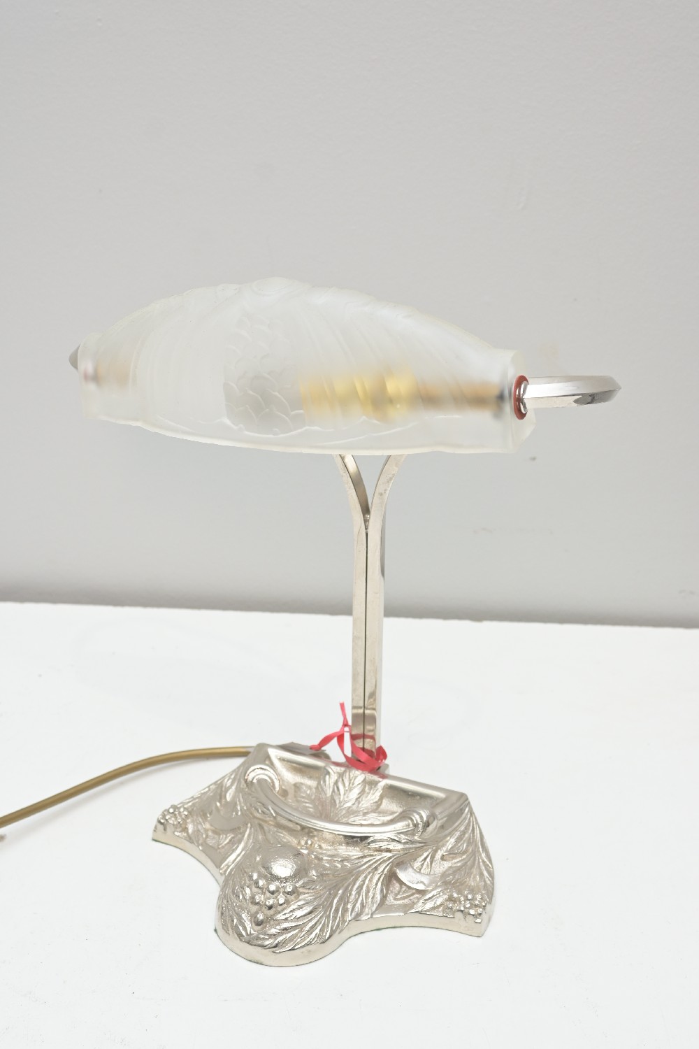 AN ART DECO STYLE CHROME AND PRESSED GLASS DESK LAMP (A/F) (UNTESTED) (34H CM) (LEONARD JOEL DELIVERY SIZE: MEDIUM)