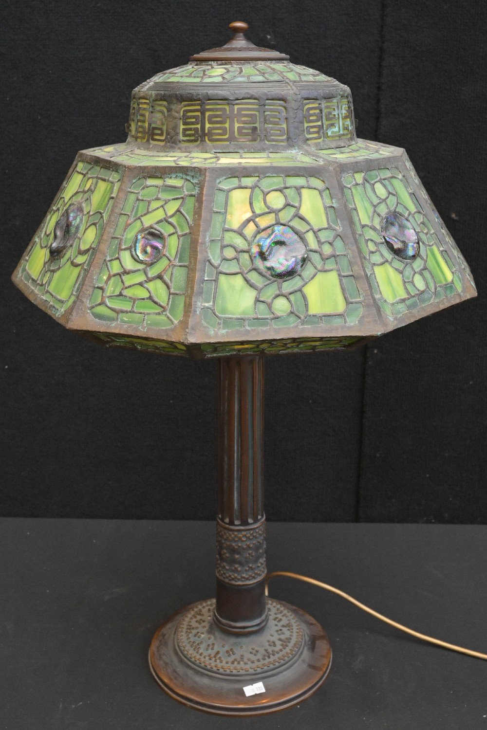 AN ART NOUVEAU STYLE LAMP WITH IMPRESSIVE STAIN-GLASS SHADE (A/F) (UNTESTED) (70H X 48DIA CM) (LEONARD JOEL DELIVERY SIZE: LARGE)
