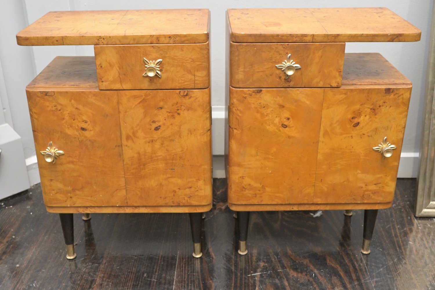 A PAIR OF ART DECO BIRDS EYE MAPLE BEDSIDES (A/F) (67H X 60W X 35D CM) (LEONARD JOEL DELIVERY SIZE: LARGE)