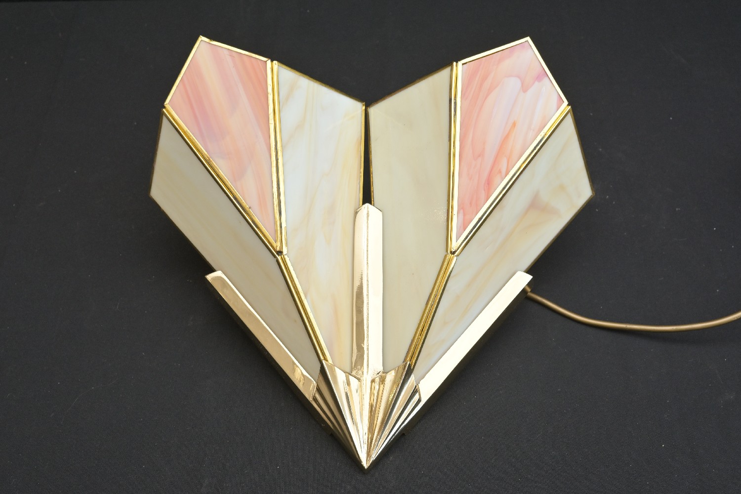 AN ART DECO REVIVAL 1980S FROSTED AND COLOURED GLASS WALL LIGHT (A/F) (UNTESTED) (34H X 37W X 12D CM) (LEONARD JOEL DELIVERY SIZE: MEDIUM)