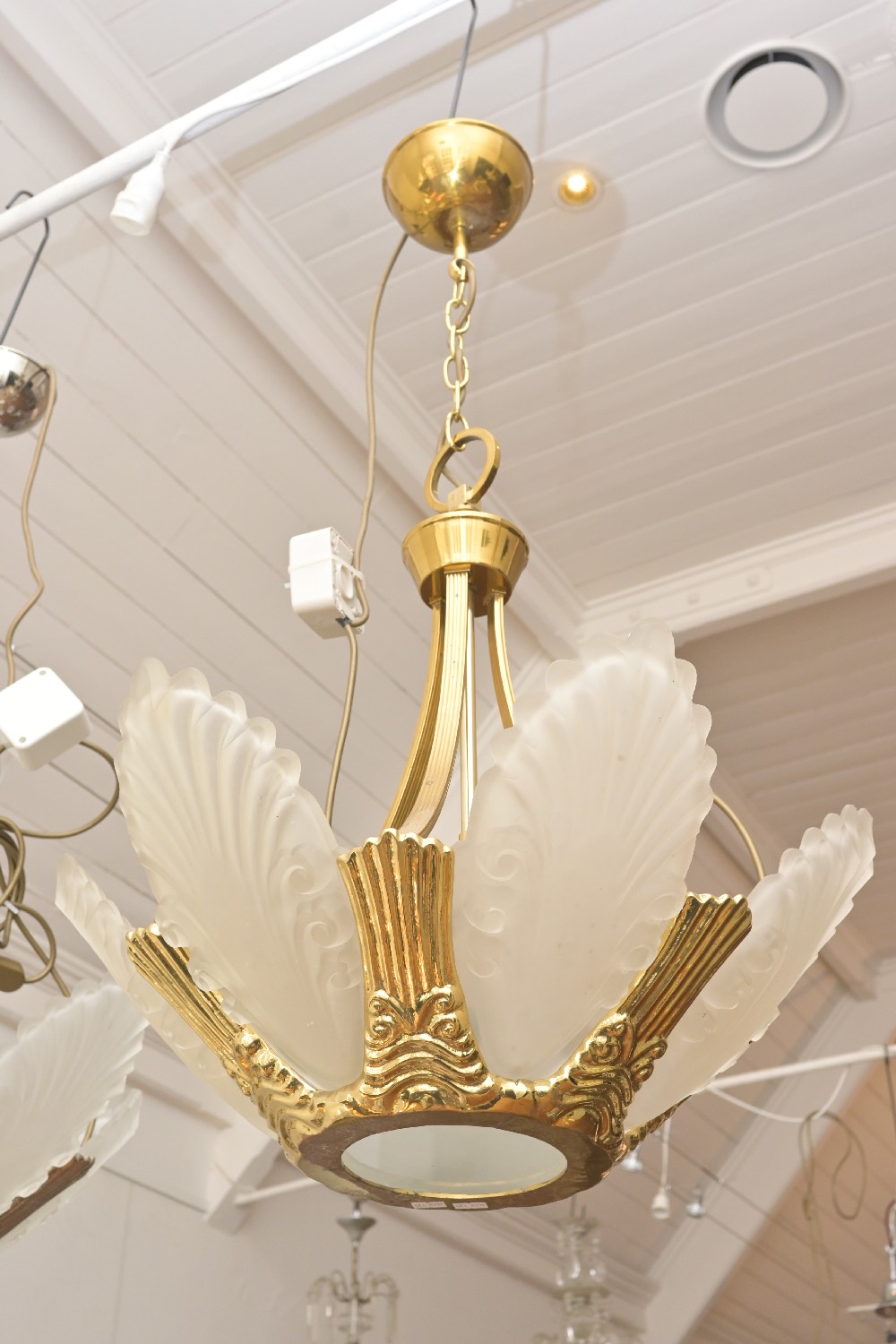 AN ART DECO STYLE BRASS AND FROSTED GLASS CEILING LIGHT (A/F) (UNTESTED) (110H X 50DIA CM) (PLEASE NOTE THIS HEAVY ITEM MUST BE REMOVED BY CARRIERS AT THE CUSTOMER'S EXPENSE. LEONARD JOEL STAFF CANNOT ASSIST CARRYING THIS ITEM) (X-LARGE ITEM)