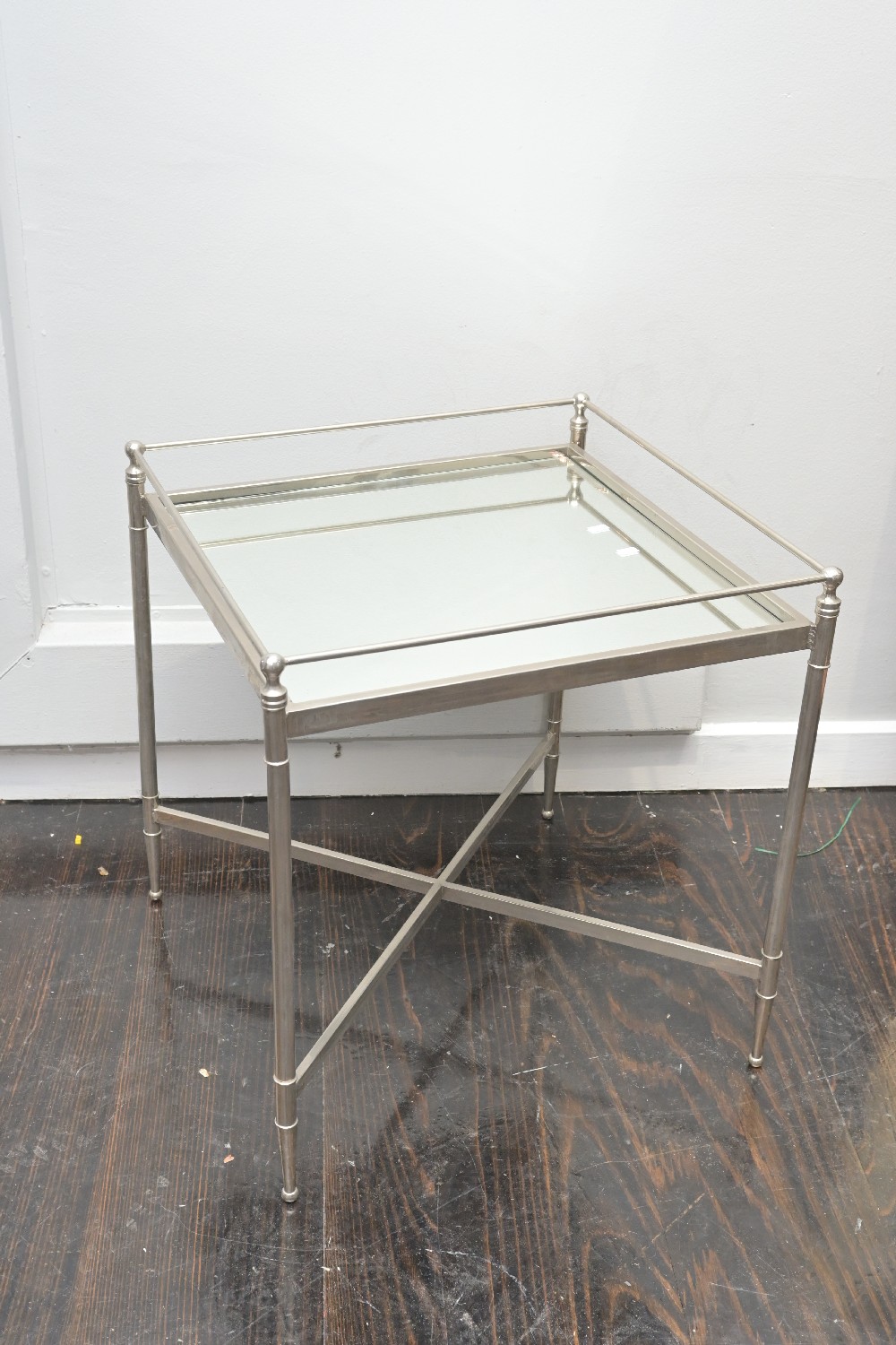 A CONTEMPORARY MIRRORED AND CHROME OCCASIONAL TABLE (A/F) (60H X 57W X 57D CM) (LEONARD JOEL DELIVERY SIZE: LARGE)
