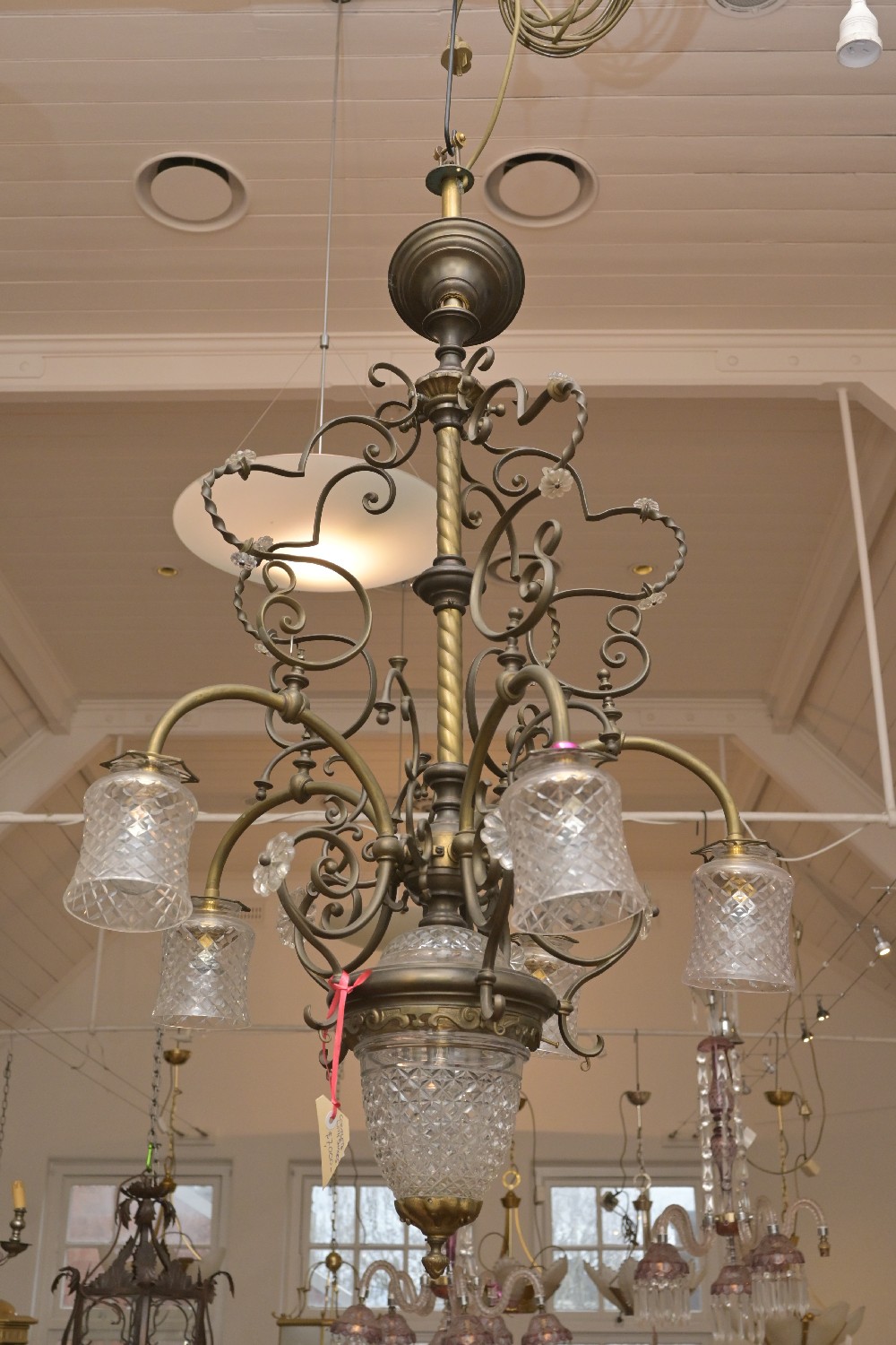 A 19TH CENTURY STYLE SIX GLOBE PRESSED GLASS AND BRASS CHANDELIER (A/F) (UNTESTED) (110H X 63DIA CM) (LEONARD JOEL DELIVERY SIZE: X-LARGE)