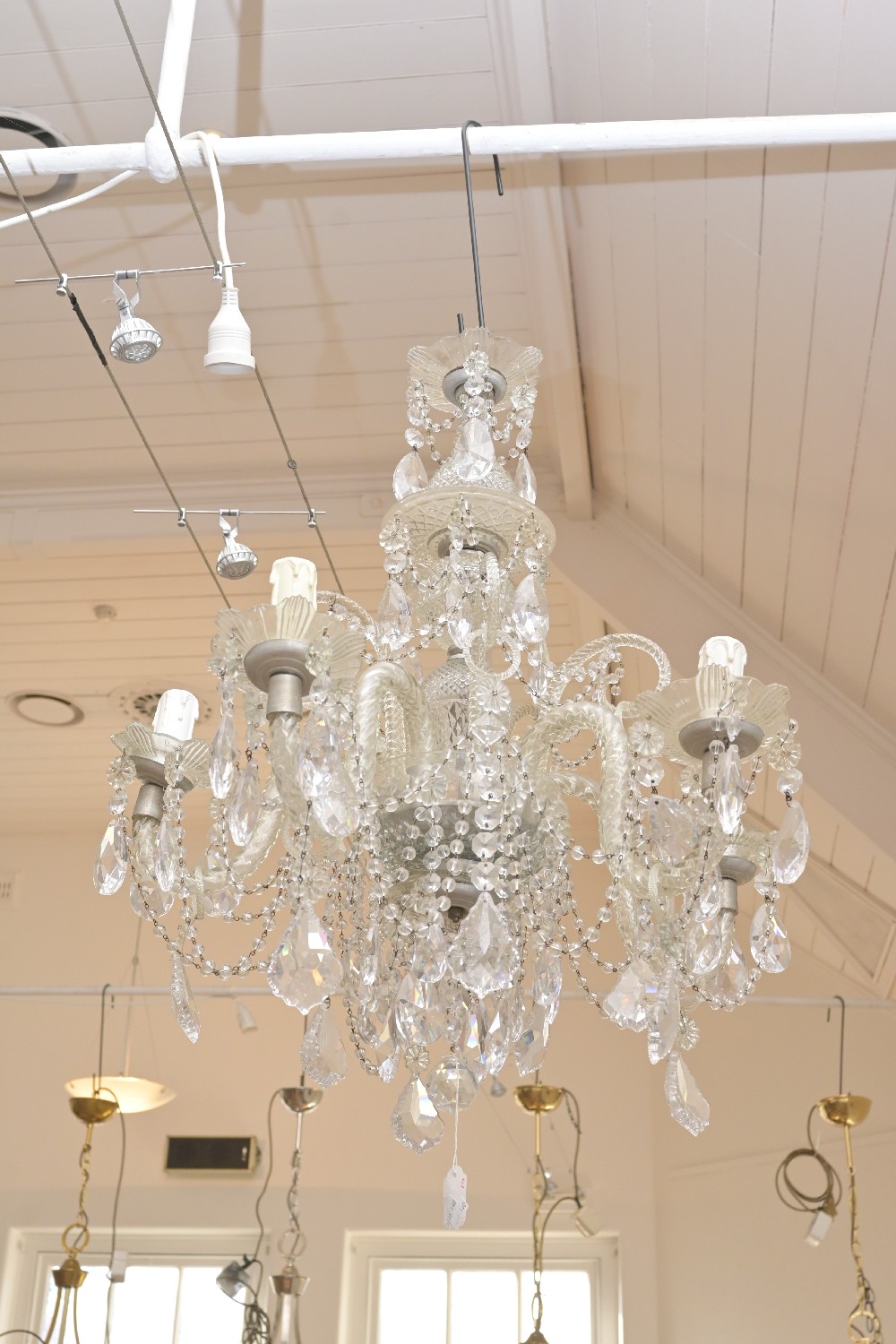 A 20TH CENTURY FIVE BRANCH CRYSTAL AND GLASS CHANDELIER (A/F) (UNTESTED) (70H X 50DIA CM) (PLEASE NOTE THIS HEAVY ITEM MUST BE REMOVED BY CARRIERS AT THE CUSTOMER'S EXPENSE. LEONARD JOEL STAFF CANNOT ASSIST CARRYING THIS ITEM) (X-LARGE ITEM)