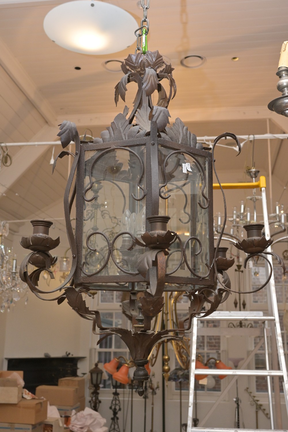 A 19TH CENTURY STYLE SIMULATED WROUGHT IRON AND GLASS FIVE GLOBE LANTERN FORM LANTERN EMANATING SIX EXTERNAL SCONCES (84H X 68DIA CM) (UNTESTED) (LEONARD JOEL DELIVERY SIZE: X-LARGE)
