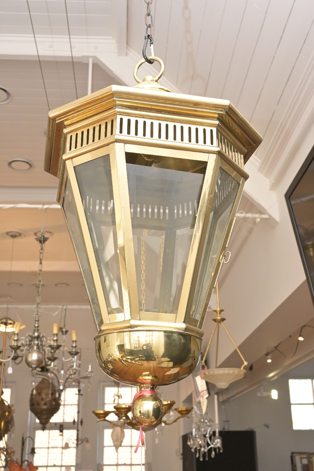 A BRASS AND GLASS LANTERN (70H X 50DIA CM) (PLEASE NOTE THIS HEAVY ITEM MUST BE REMOVED BY CARRIERS AT THE CUSTOMER'S EXPENSE. LEONARD JOEL STAFF CANNOT ASSIST CARRYING THIS ITEM) (X-LARGE ITEM)