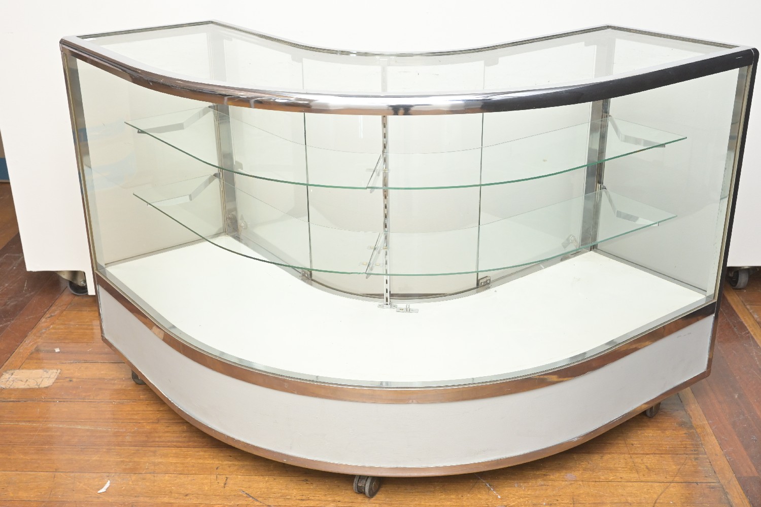 A CONTEMPORARY CONTOURED SHOP DISPLAY CABINET ON WHEELS WITH GLASS SHELVES (A/F) (UNTESTED) (96H X 166W X 85D CM) (PLEASE NOTE THIS HEAVY ITEM MUST BE REMOVED BY CARRIERS AT THE CUSTOMER'S EXPENSE. LEONARD JOEL STAFF CANNOT ASSIST CARRYING THIS ITEM) (X-LARGE ITEM)