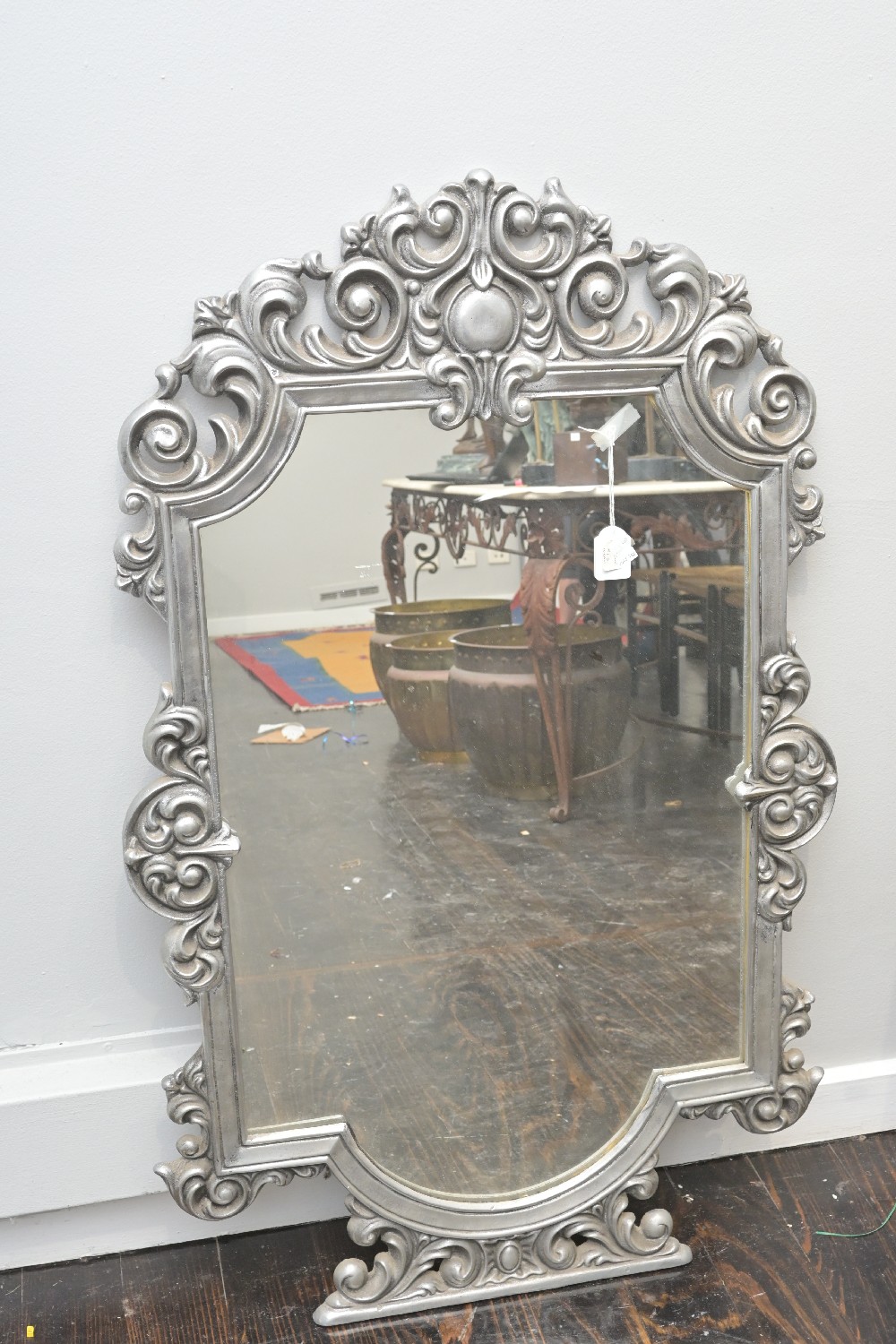 AN ORNATE SILVERED METAL MIRROR (A/F) (120 X 71 CM) (LEONARD JOEL DELIVERY SIZE: LARGE)