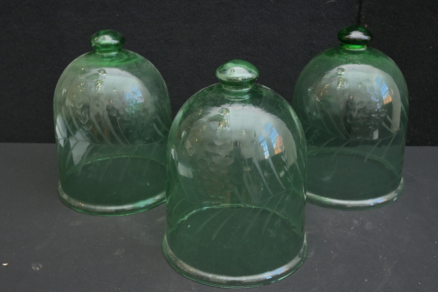 A GROUP OF THREE ETCHED GREEN GLASS HUNDI FLOAT LIGHT SHADES (A/F) (32H X 24DIA CM) (LEONARD JOEL DELIVERY SIZE: MEDIUM)