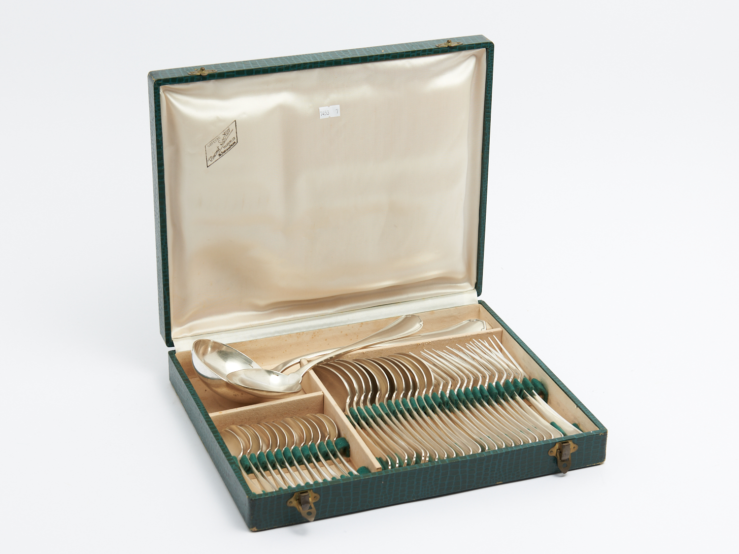 A CHRISTOFLE SILVER PLATE CANTEEN, 12 'JAPONAIS' SETTINGS OF THREE PIECES WITH TWO SERVERS W36.5CM (CASE), LEONARD JOEL DELIVERY SIZE: MEDIUM