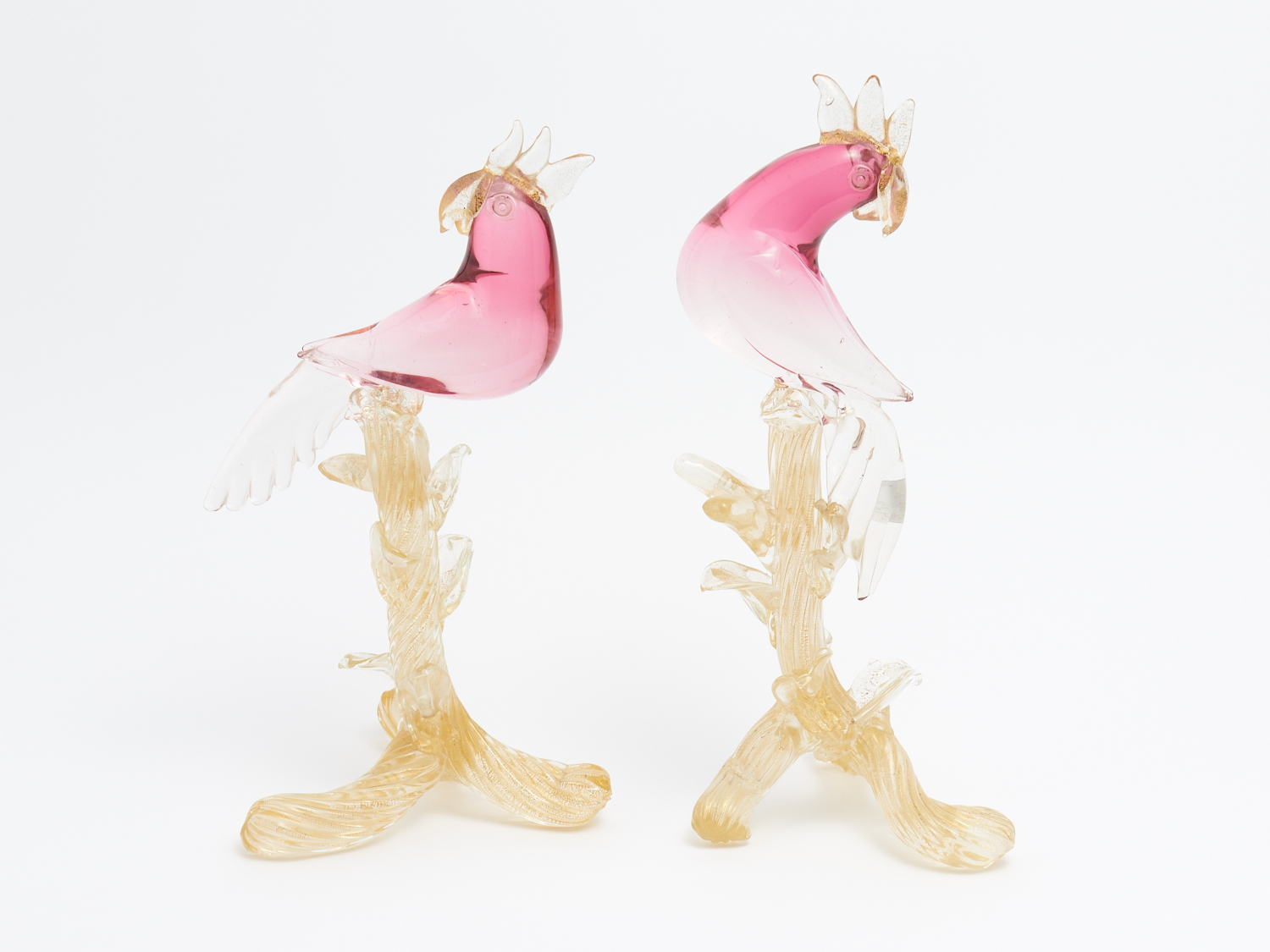 A PAIR OF CENEDESE GLASS PARROTS WITH GOLD INCLUSIONS, ATTRIBUTED TO BARBINI H.40.5CM, LEONARD JOEL DELIVERY SIZE: LARGE