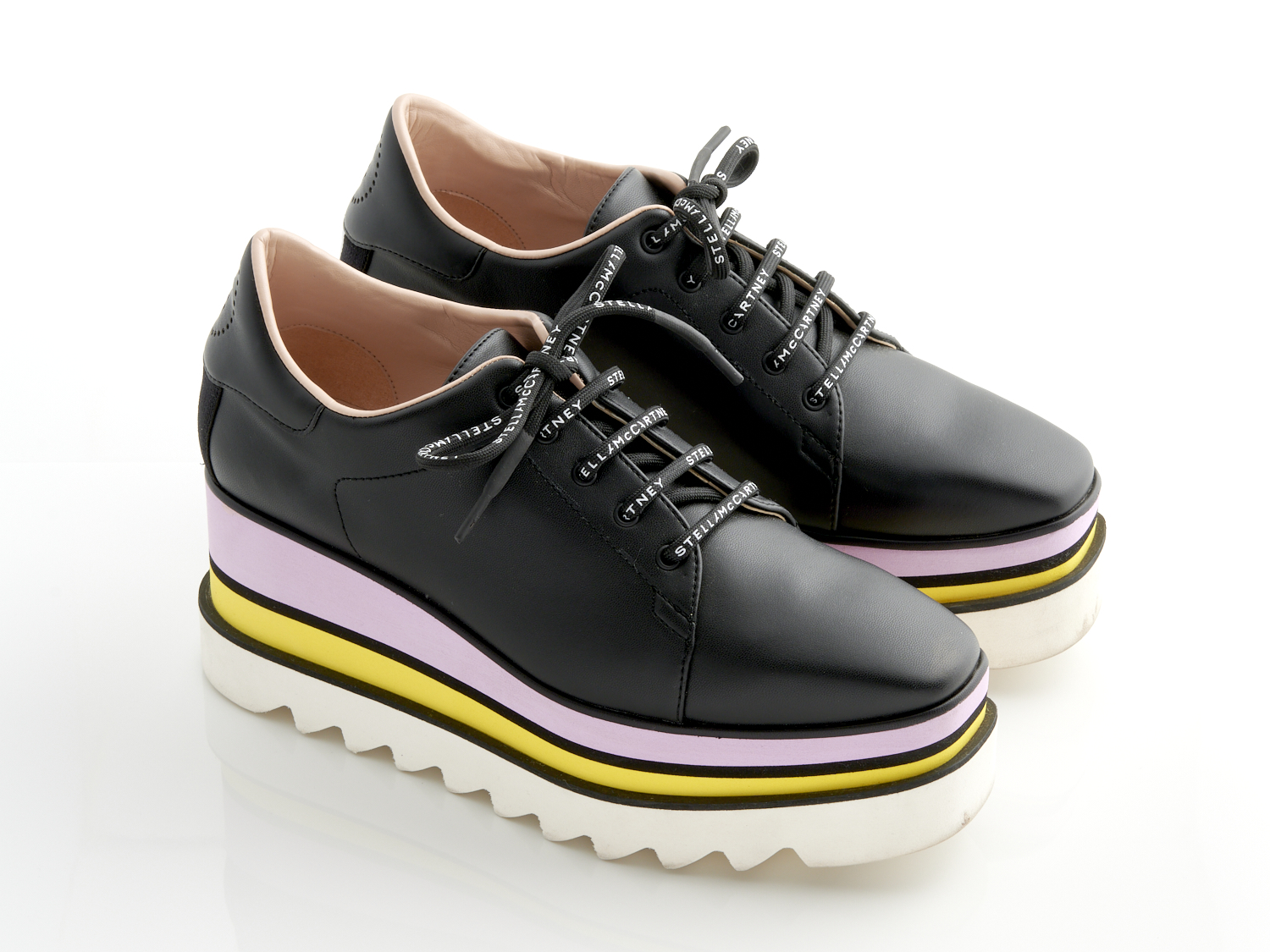 STELLA MCCARTNEY, A PAIR OF PLATFORM LOAFERS IN BLACK LEATHER WITH YELLOW, PINK, WHITE AND BLACK PLATFORM, MARKED SIZE 37, ACCOMPANIED BY DUST BAG