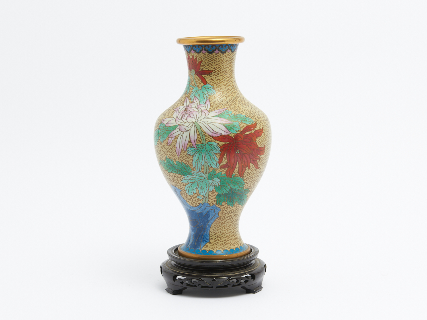 A CHINESE CLOISONNE ENAMEL VASE ON WOODEN STAND H.30CM, LEONARD JOEL DELIVERY SIZE: MEDIUM