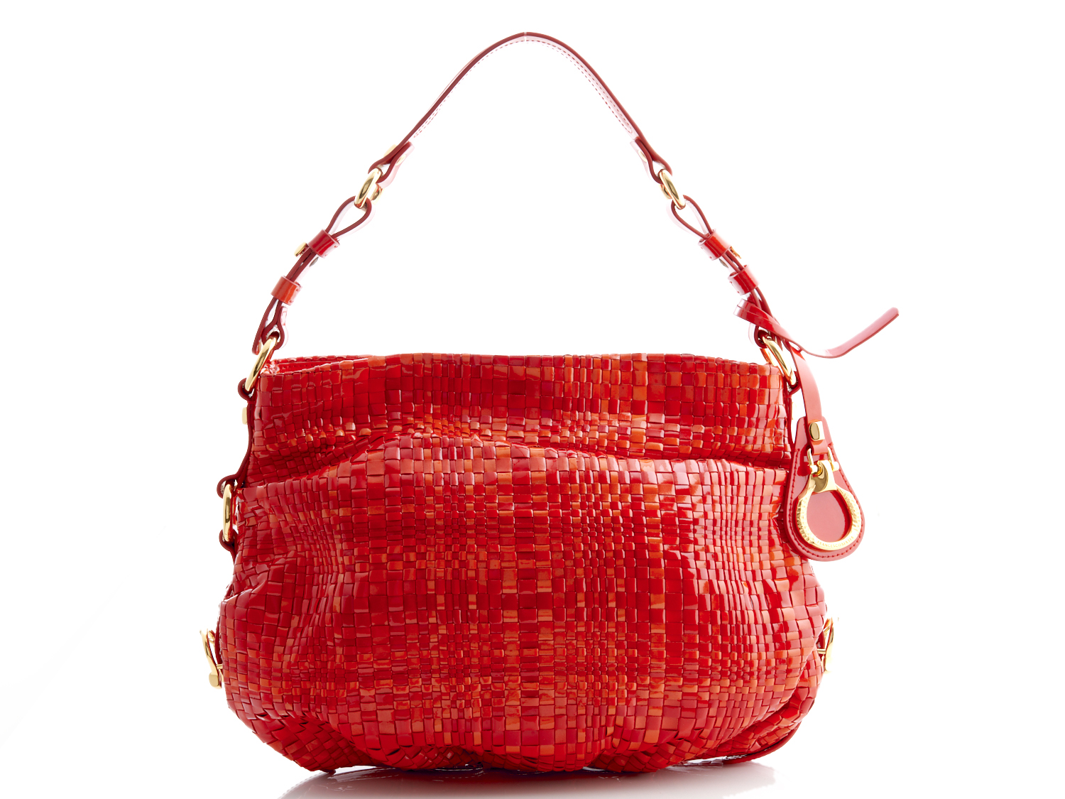 FRANCESCO BIASIA, AN ITALIAN HANDBAG STYLED IN WOVEN RED AND ORANGE PATENT LEATHER WITH GOLD TONE METAL HARDWARE, 27 X 35 X 3CM
