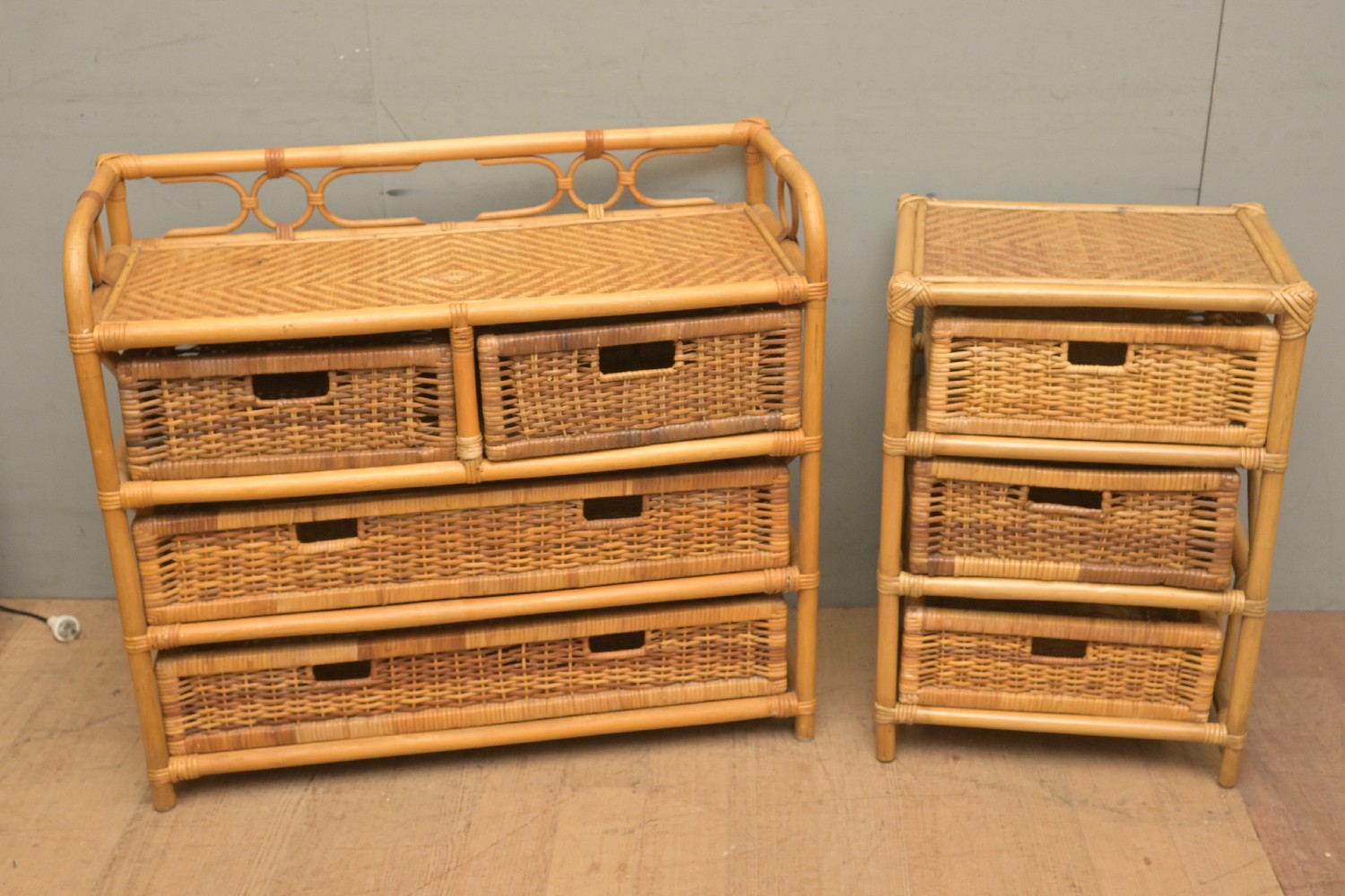 TWO VINTAGE CANE CHESTS OF DRAWERS (A/F) (76H X 85W X 37D CM) (LEONARD JOEL DELIVERY SIZE: X-LARGE)