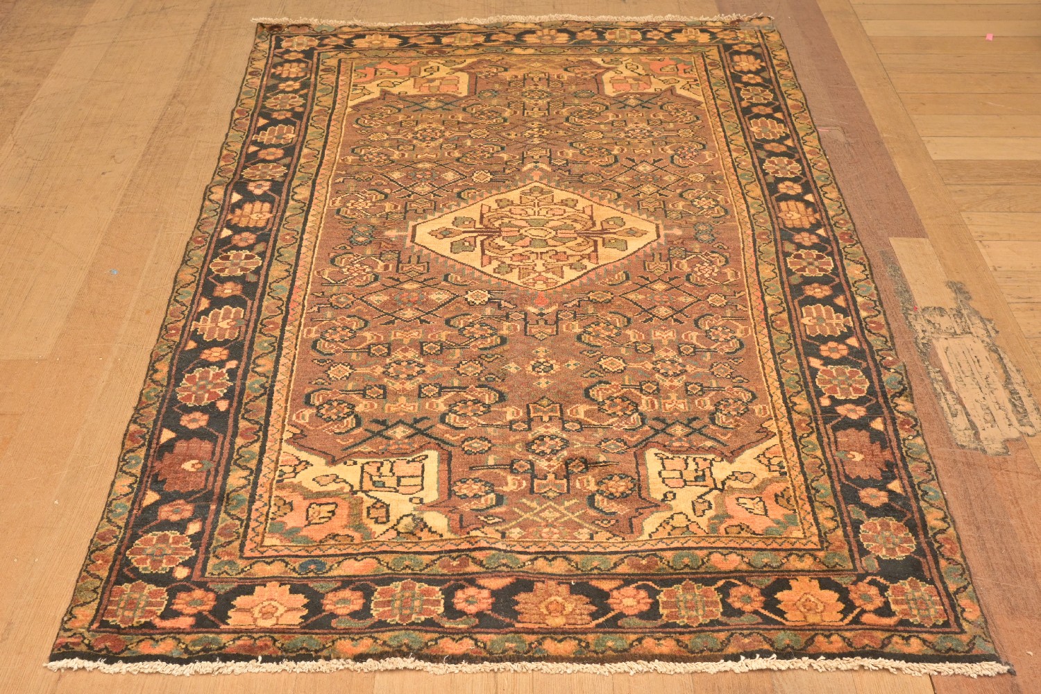 A PERSIAN BORCHALU RUG, CIRCA 1960'S, 100% WOOL & NATURAL DYES, VINTAGE PILE. HAND-KNOTTED WITH A CENTRAL FLORAL MEDALLION AND CORNER MEDALLIONS IN SOFT MELLOW TONES. ALL OVER HERATI MOTIFS. BORDER OF INK BLUE WITH ROSETTES. SIZE: 215 X 138 CM ORIGIN: PERSIA - RRP: $2,100