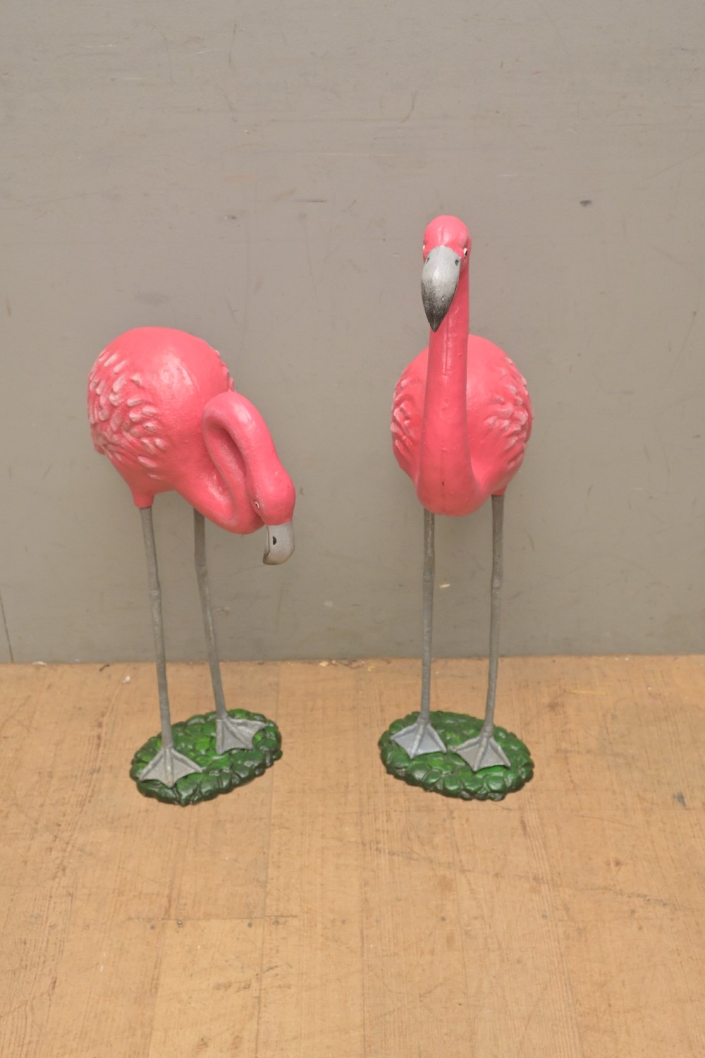 A PAIR OF CAST METAL FLAMINGOES (74H CM) (LEONARD JOEL DELIVERY SIZE: LARGE)