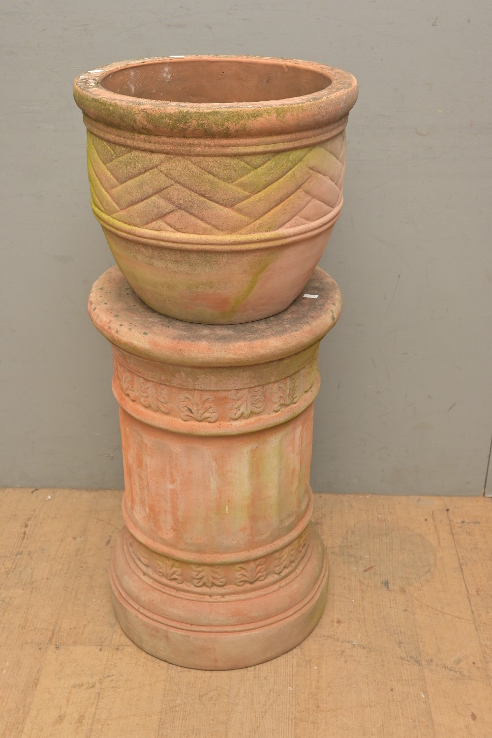 A TERRACOTTA PEDESTAL AND PLANTER (A/F) (95H X 35D CM) (PLEASE NOTE THIS HEAVY ITEM MUST BE REMOVED BY CARRIERS AT THE CUSTOMER'S EXPENSE. LEONARD JOEL STAFF CANNOT ASSIST CARRYING THIS ITEM) (X-LARGE ITEM)
