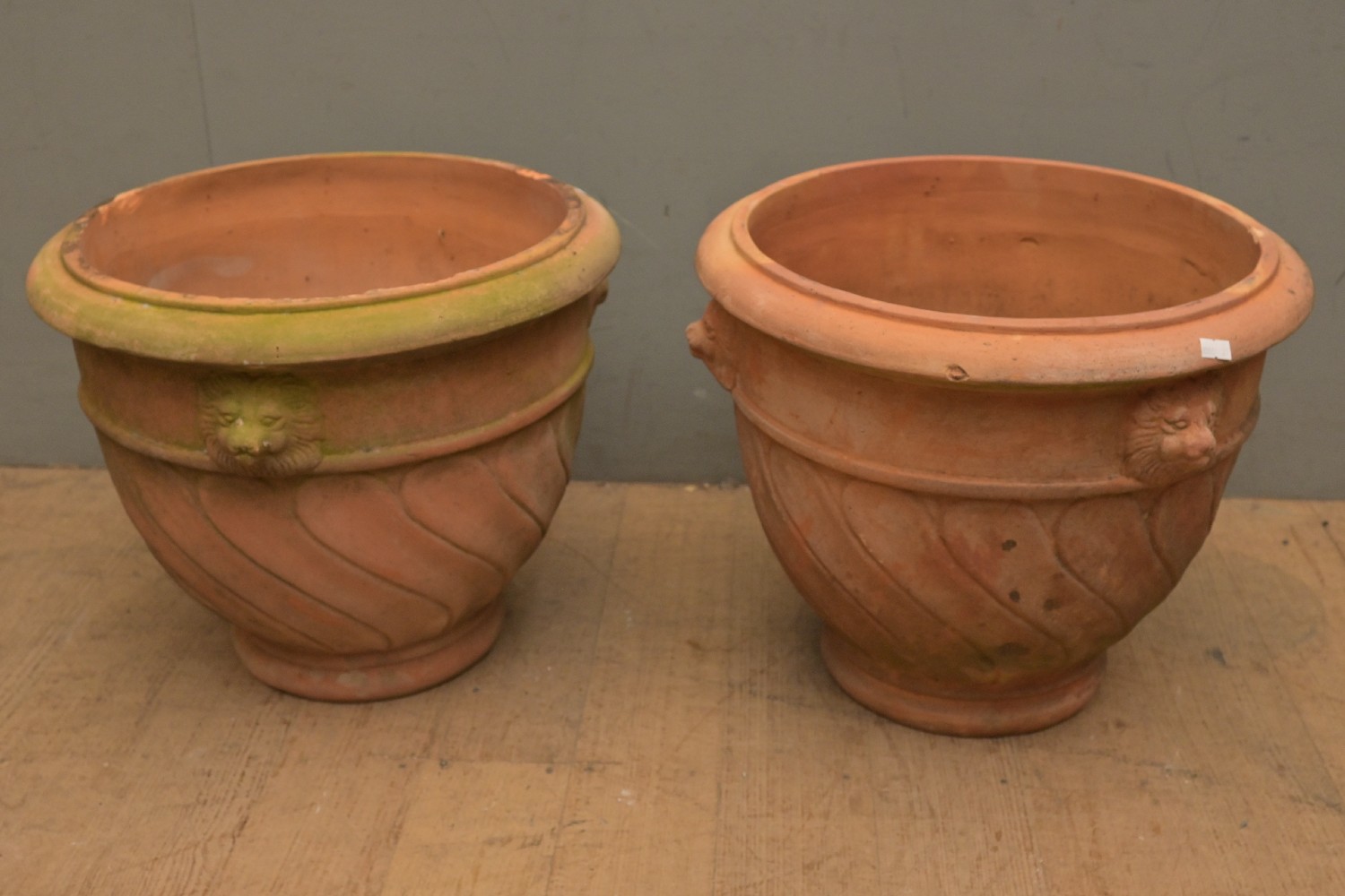 A PAIR OF TERRACOTTA PLANT POTS WITH LION HEADS (36H X 44D CM) (LEONARD JOEL DELIVERY SIZE: X-LARGE)