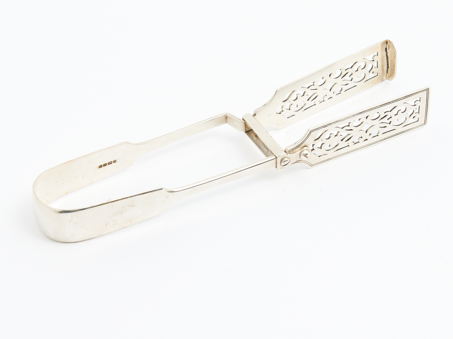 A PAIR OF PIERCED STERLING SILVER TONGS 192G L.26CM, LEONARD JOEL DELIVERY SIZE: SMALL