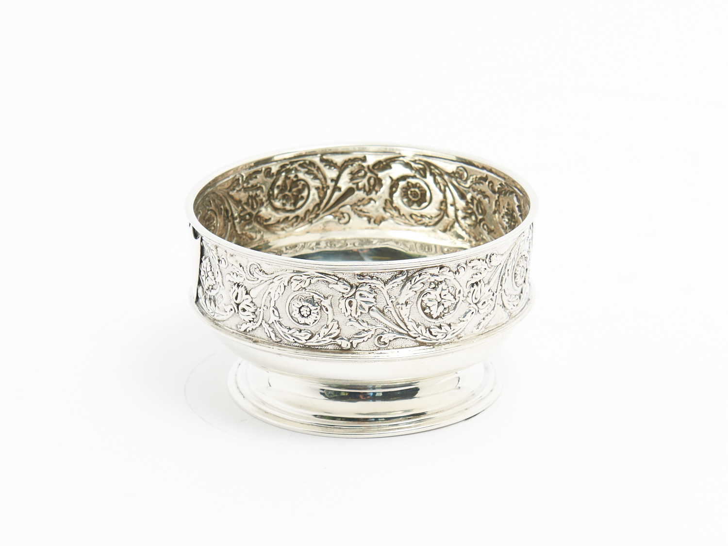 A 19TH CENTURY BRITTANIA 958 SILVER REPOUSSE FOOTED BOWL 106G DIA.9.5CM, LEONARD JOEL DELIVERY SIZE: SMALL
