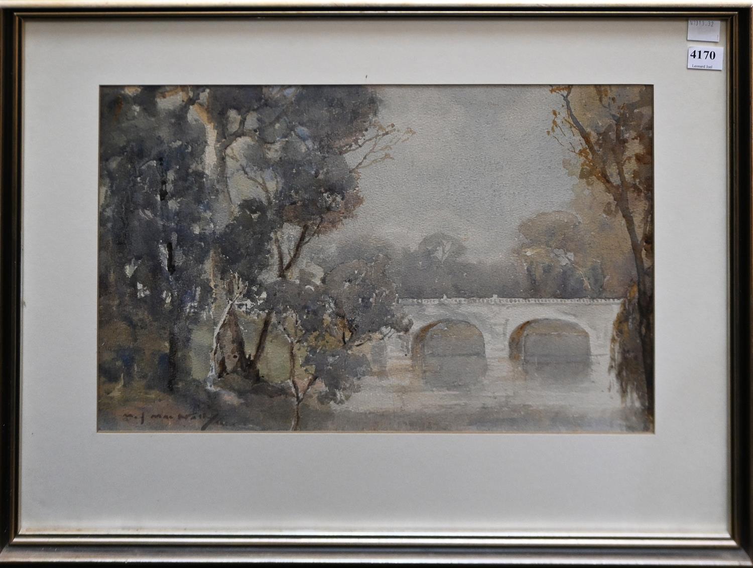 MATHEW JAMES MACNALLY, LANDSCAPE WITH BRIDGE C.1916, WATERCOLOUR AND GOUACHE, SIGNED AND DATED LOWER LEFT, 26.5 X 40CM, FRAME SIZE: 44 X 55CM