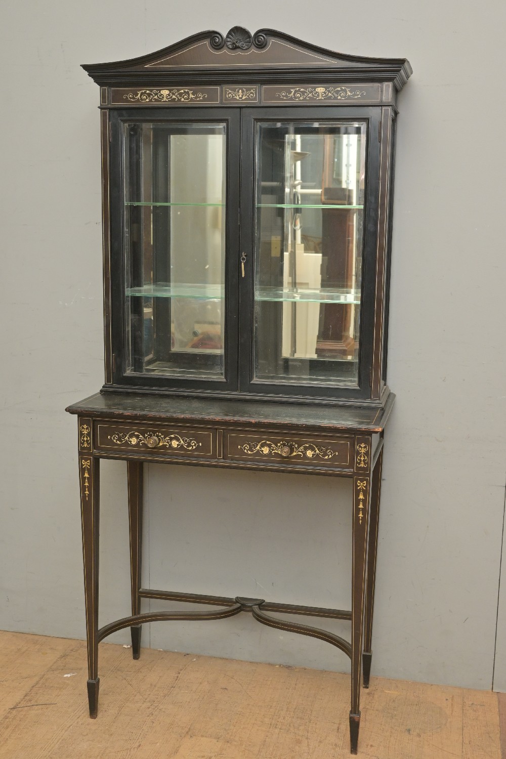 A LATE VICTORIAN EBONISED AND INLAID DISPLAY CABINET ON STAND (A/F) - (KEY IN OFFICE) (185H X 84W X 46D CM) (LEONARD JOEL DELIVERY SIZE: X-LARGE)