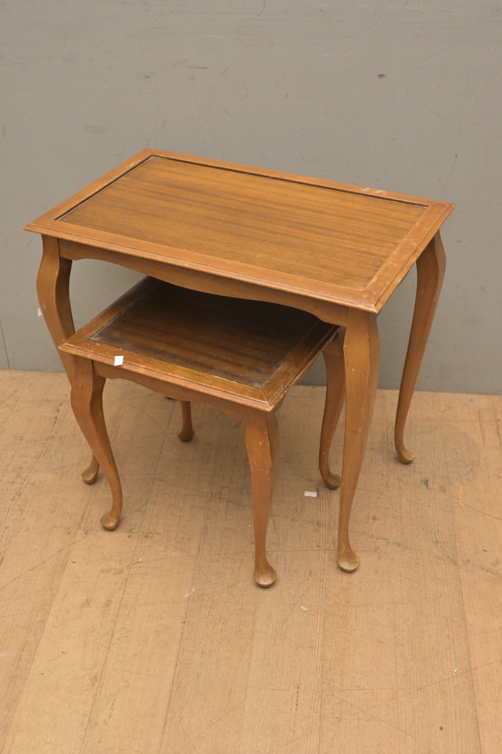 A SET OF TWO TABLES ON CABRIOLE LEGS -ONE MISSING GLASS (A/F) (53H X 57W X 36D CM) (LEONARD JOEL DELIVERY SIZE: LARGE)