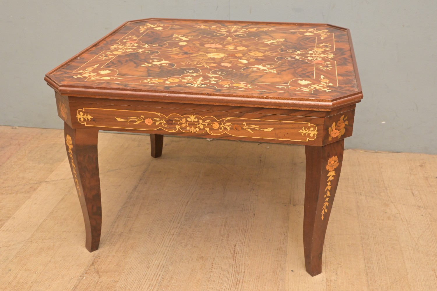 AN ITALIAN MARQUETRY LOW GAMES TABLE (A/F) (52H X 76W X 77D CM) (LEONARD JOEL DELIVERY SIZE: X-LARGE)