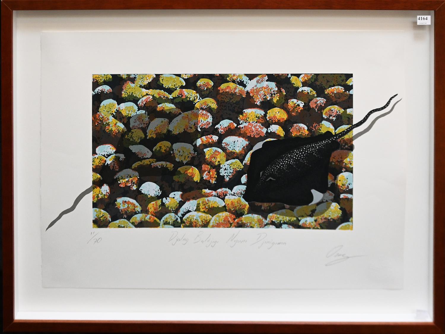 LIN ONUS, DJALNG BALTJIGI NGUKI DJINIGMA (WISH YOU WERE HERE), SCREENPRINT 11/70, SIGNED, TITLED AND EDITIONED BELOW IMAGE, 48 X 69CM (REVEAL), FRAME SIZE: 63.5 X 83CM