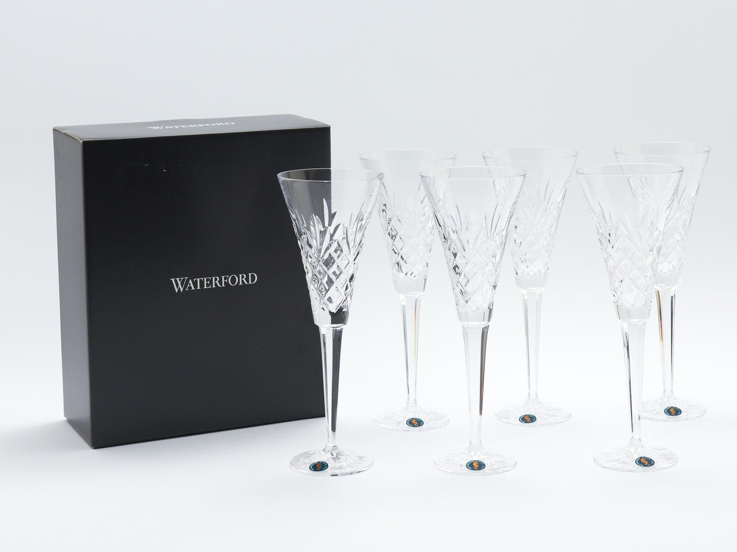 A SET OF SIX LARGE WATERFORD CRYSTAL CHAMPAGNE FLUTES WITH ORIGINAL BOXES H.27CM, LEONARD JOEL DELIVERY SIZE: LARGE