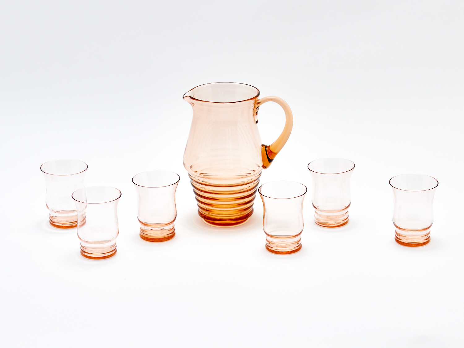A MID CENTURY PINK GLASS JUG AND SIX GLASSES H.21CM (JUG), LEONARD JOEL DELIVERY SIZE: LARGE