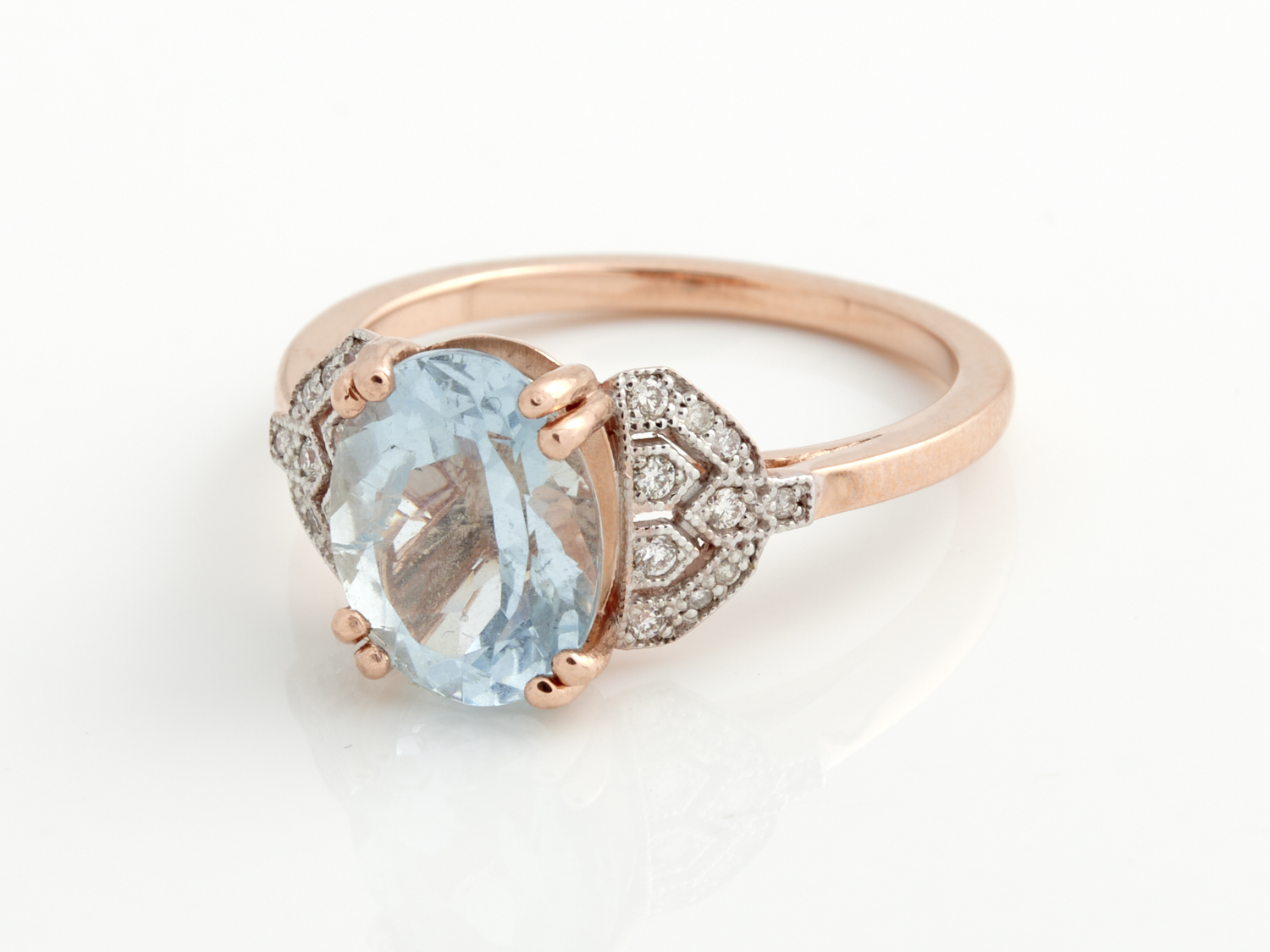 AN AQUAMARINE AND DIAMOND RING IN 14CT ROSE GOLD, SIZE O, 3.7GMS