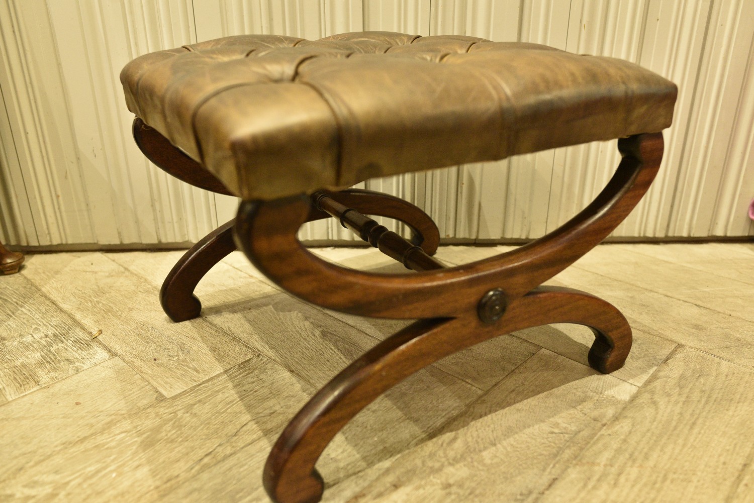 A LOUIS PHILIPPE-STYLE MAHOGANY STOOL, THE TOP UPHOLSTERED IN BUTTONED GREEN LEATHER. (45H X 56W X 51D CM) (LARGE ITEM)