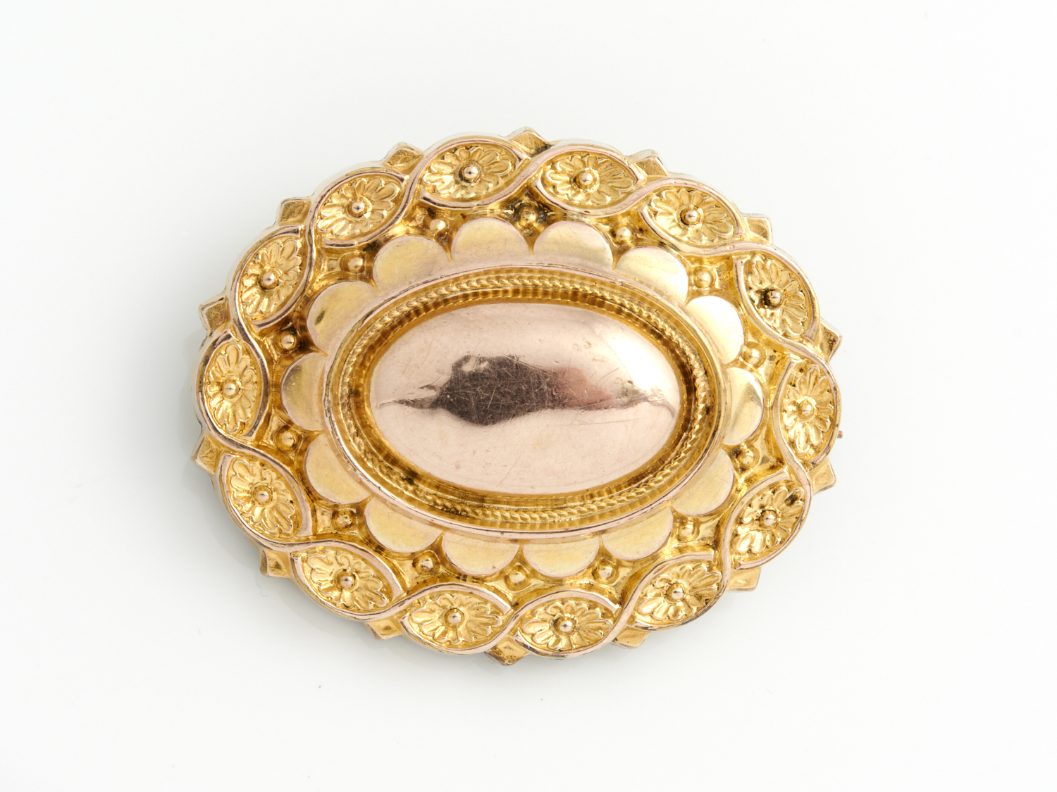 A VICTORIAN ETRUSCAN REVIVAL BROOCH IN GOLD PLATE, 32 X 40MM, 6.7 GMS