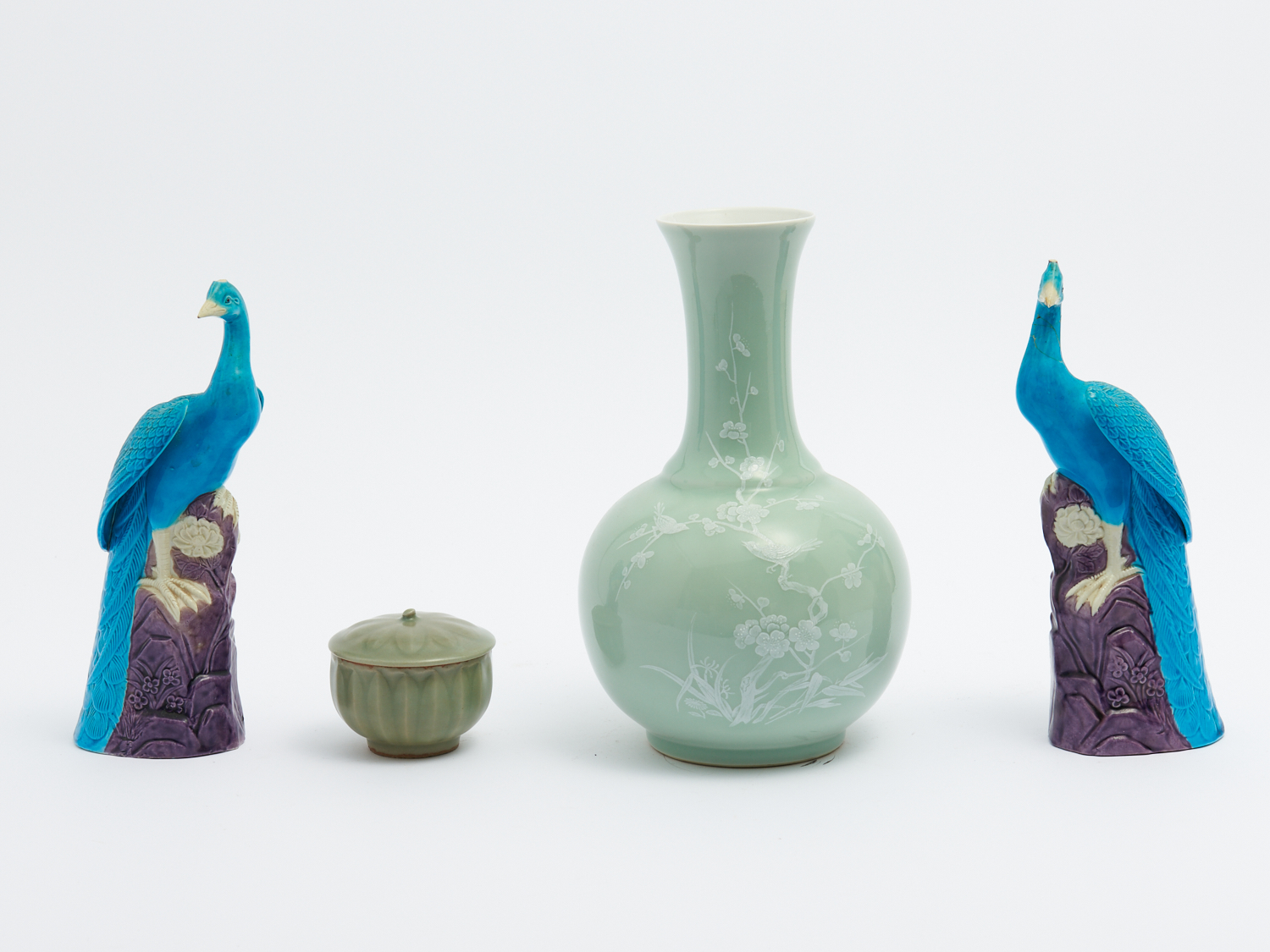 A GROUP OF CHINESE PORCELAIN INCLUDING TWO PIECES OF CELADON AND A PAIR OF PHEONIXES (A/F) H.27CM (TALLEST), LEONARD JOEL DELIVERY SIZE: MEDIUM