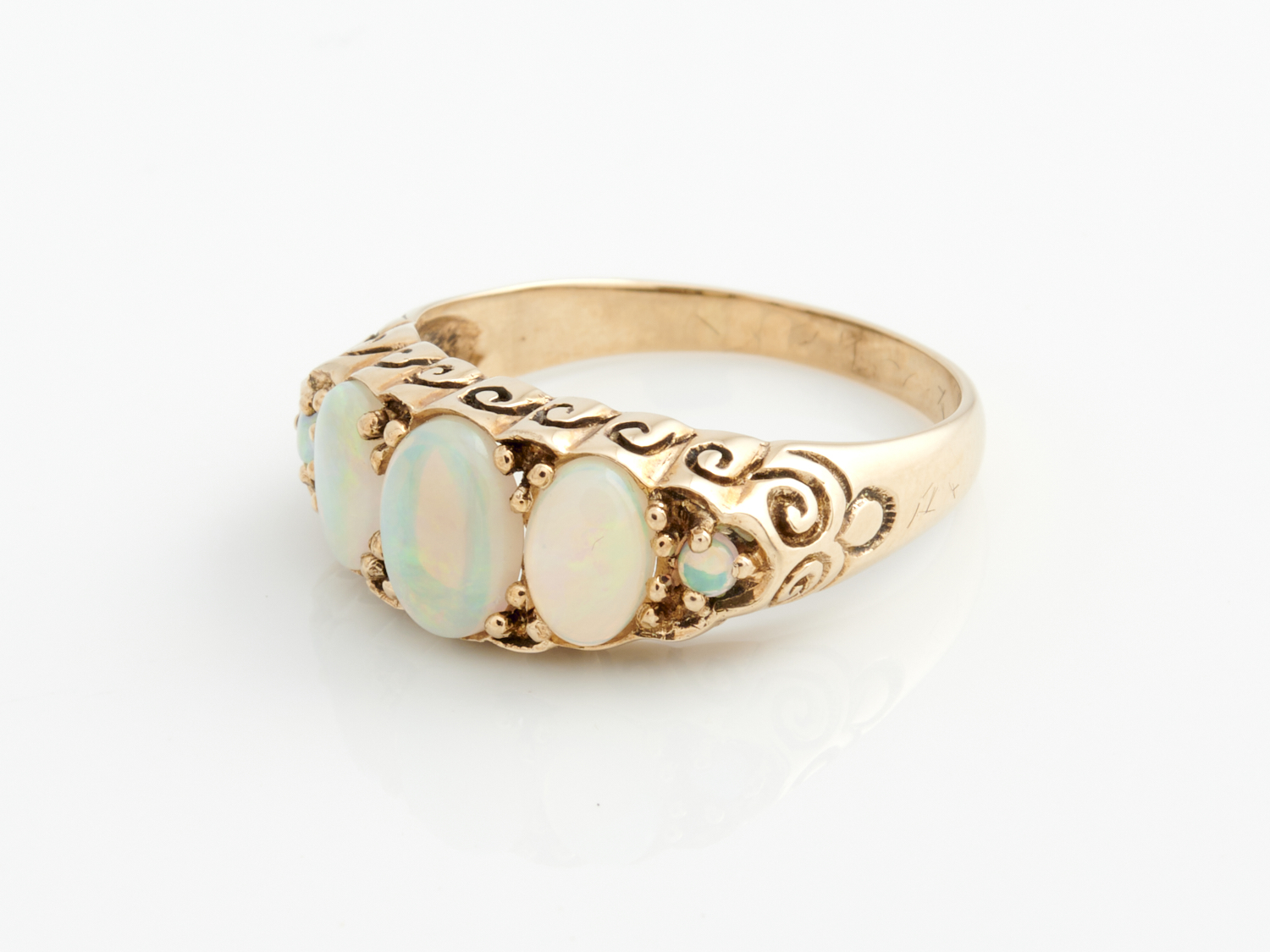 AN EDWARDIAN STYLE FIVED STONE OPAL RING IN 9CT GOLD, SIZE N1/2, 2.81GMS