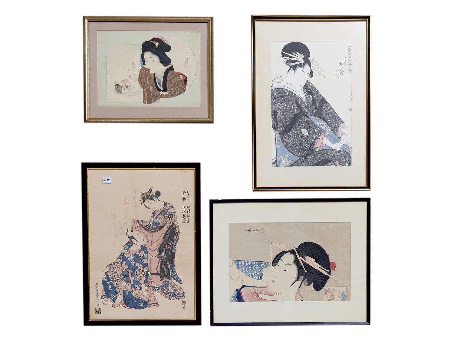 A GROUP OF FOUR FRAMED JAPANESE WOODBLOCK PRINTS, RESPECTIVELY BY ISHIKAWA TOYONOBU, UTAMARO, AND KEISAI EISEN (LATER IMPRESSIONS), 43 x 31CM AND SMALLER, LEONARD JOEL DELIVERY SIZE: MEDIUM