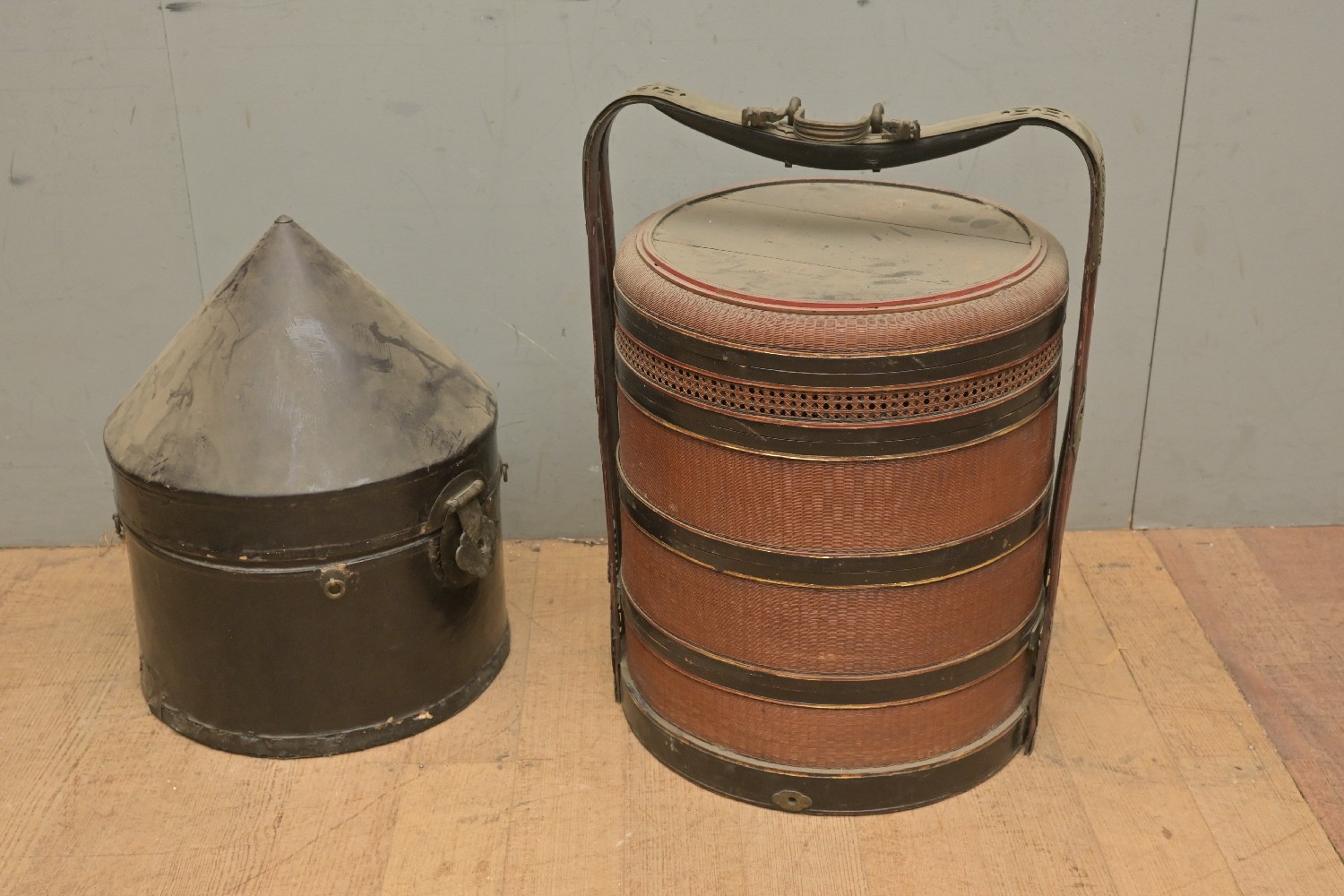 A CHINESE HAT BOX AND A FOOD STORAGE BOX (A/F) (67H X 46D CM) (LEONARD JOEL DELIVERY SIZE: LARGE)