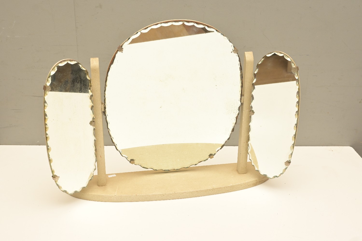 A MID-CENTURY SCALLOPED EDGE BATHROOM MIRROR (47H X 62W X 15D CM) (LEONARD JOEL DELIVERY SIZE: LARGE)