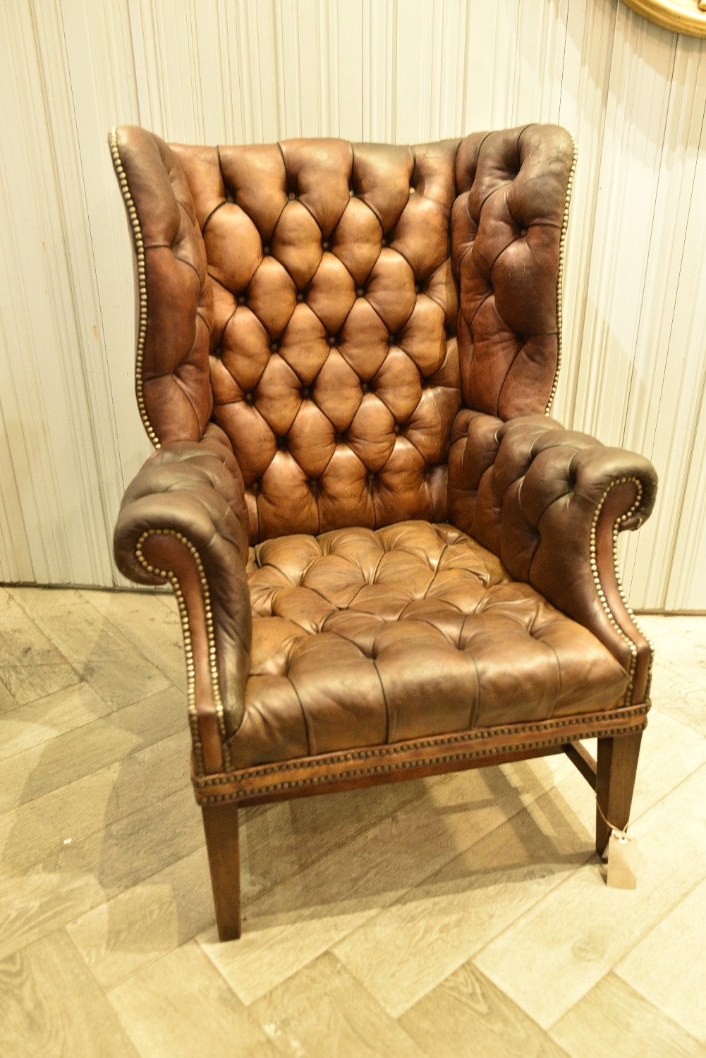 A GEORGE III-STYLE WING ARMCHAIR UPHOLSTERED IN BUTTONED BROWN LEATHER (A/F) (115H X 85W X 87D CM) (PLEASE NOTE THIS HEAVY ITEM MUST BE REMOVED BY CARRIERS AT THE CUSTOMER'S EXPENSE. LEONARD JOEL STAFF CANNOT ASSIST CARRYING THIS ITEM) (X-LARGE ITEM)