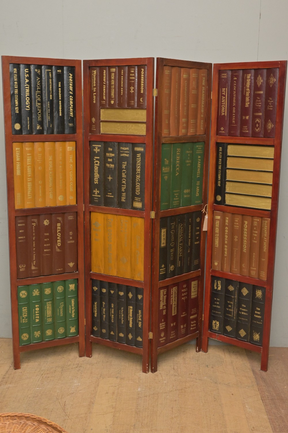 A HARDWOOD-FRAMED FOUR-LEAF SCREEN, ONE SIDE DECORATED WITH LEATHER BOOK SPINES TO RESEMBLE A BOOK-CASE (A/F) (171H X 42W CM PER PANEL) (LEONARD JOEL DELIVERY SIZE: X-LARGE)