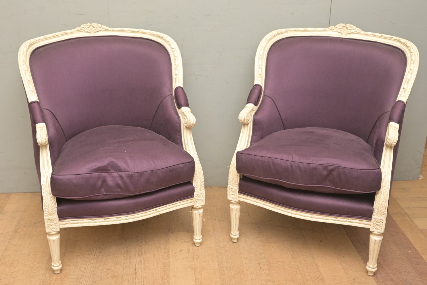 A PAIR OF LOUIS XV-STYLE HARDWOOD AND UPHOLSTERED BERGERES, THE FRAMES PAINTED WHITE (A/F) (92H X 65W X 68D CM) (LEONARD JOEL DELIVERY SIZE: X-LARGE)