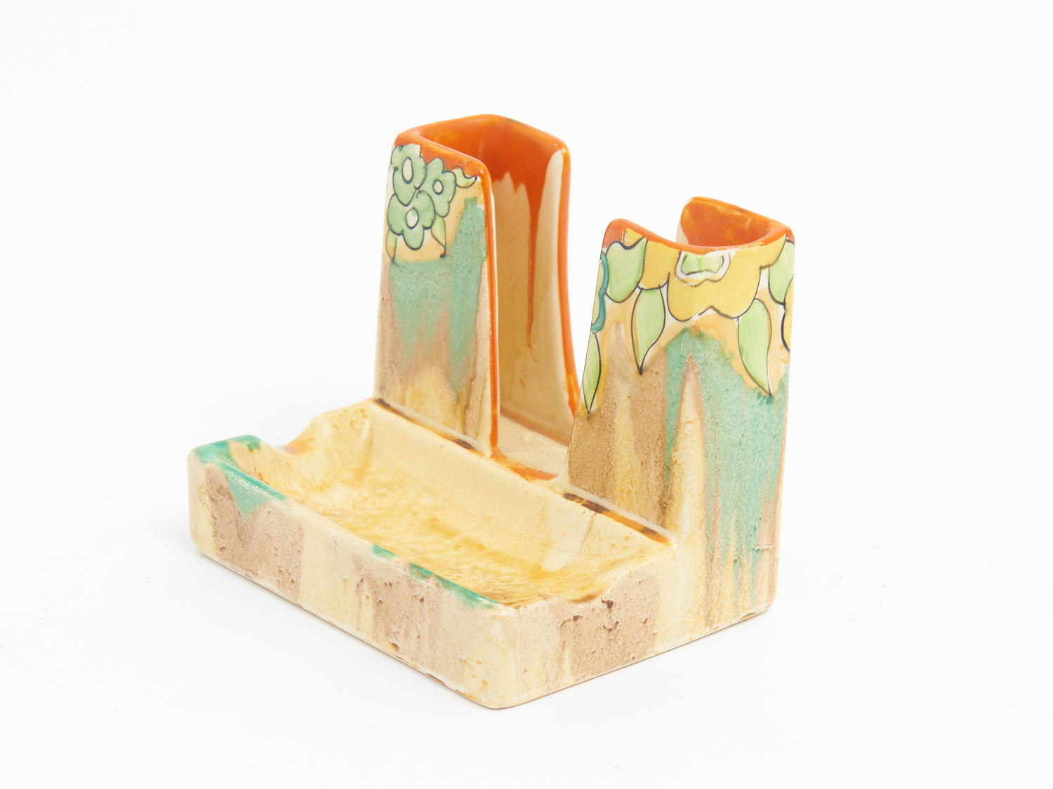 A CLARICE CLIFF CIGARETTE AND MATCH HOLDER, SHAPE 420 H.8CM, LEONARD JOEL DELIVERY SIZE: SMALL