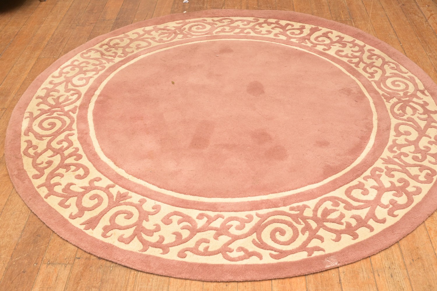 A BAYLISS CIRCULAR PINK AND WHITE RUG (A/F) (198DIA CM) (LEONARD JOEL DELIVERY SIZE: X-LARGE)