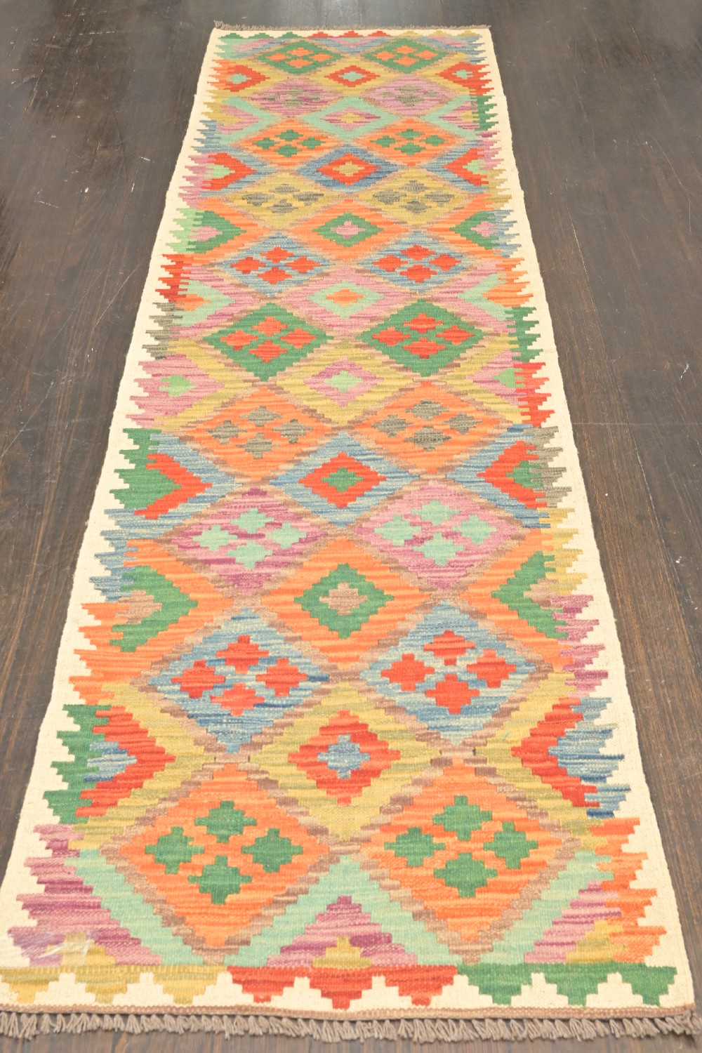 AN AFGHAN KAZAK KILIM RUNNER IN CAUCASIAN DESIGN, VEGETABLE DYES, 100% WOOL AND REVERSIBLE (298 X 80 CM) (LEONARD JOEL DELIVERY SIZE: LARGE)