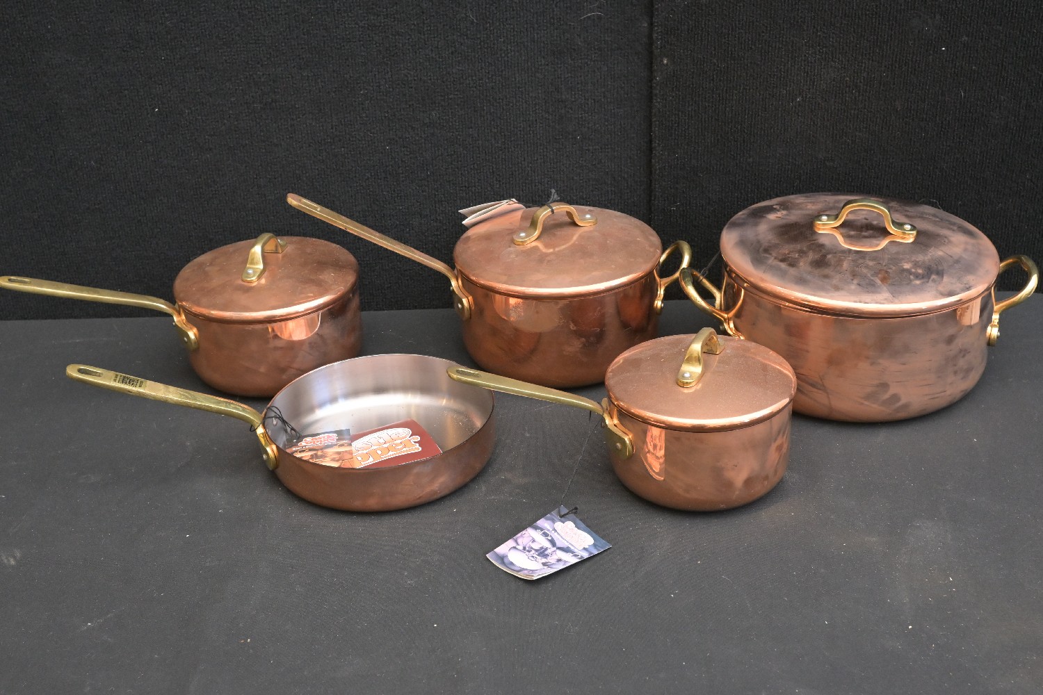 A SET OF FIVE COPPER POTS BY CASTLE COPPER, INCLUDING SAUCE PANS (A/F) (20H X 34W CM) (LEONARD JOEL DELIVERY SIZE: LARGE)
