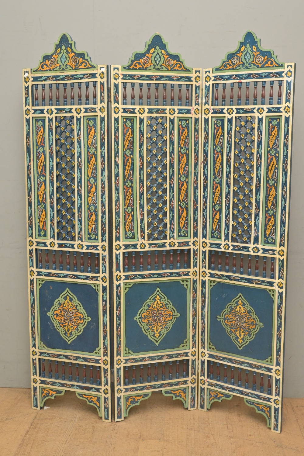 A HAND PAINTED MOROCCAN-INFLUENCED CARVED AND PIERCED THREE FOLD SCREEN (A/F) (182H X 43W CM) (LEONARD JOEL DELIVERY SIZE: LARGE)