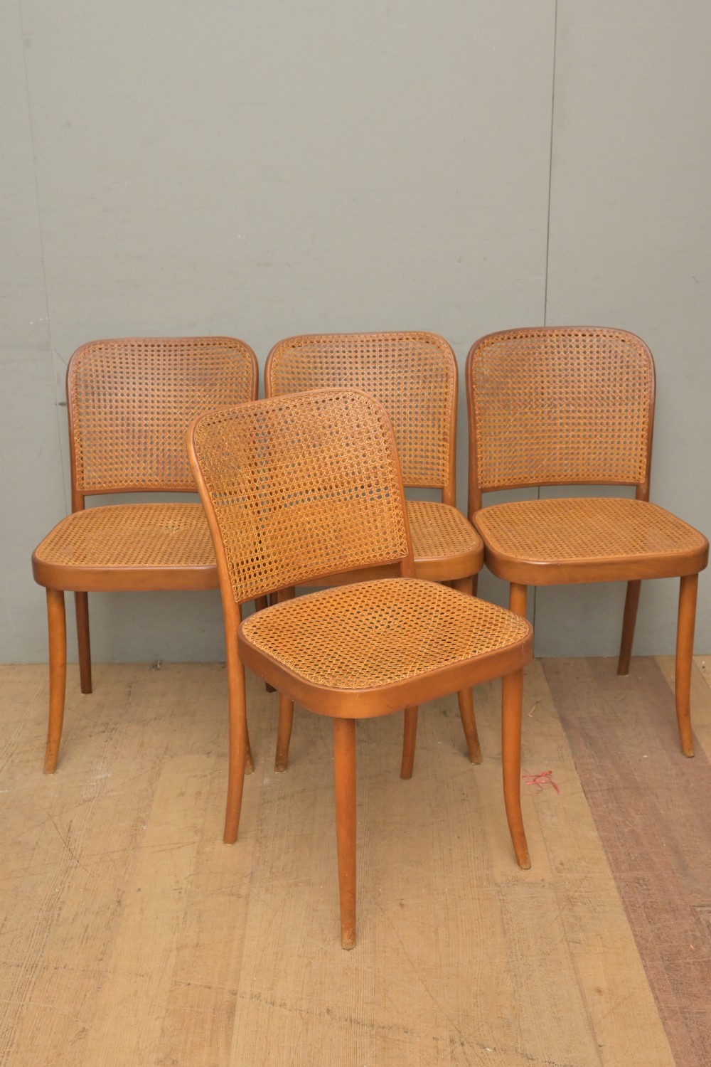 A SET OF FOUR VINTAGE CZECHOSLOVAKIAN BENTWOOD AND WOVEN CANE SEATED CHAIRS (A/F) (82H X 44W X 50D CM) (LEONARD JOEL DELIVERY SIZE: LARGE)